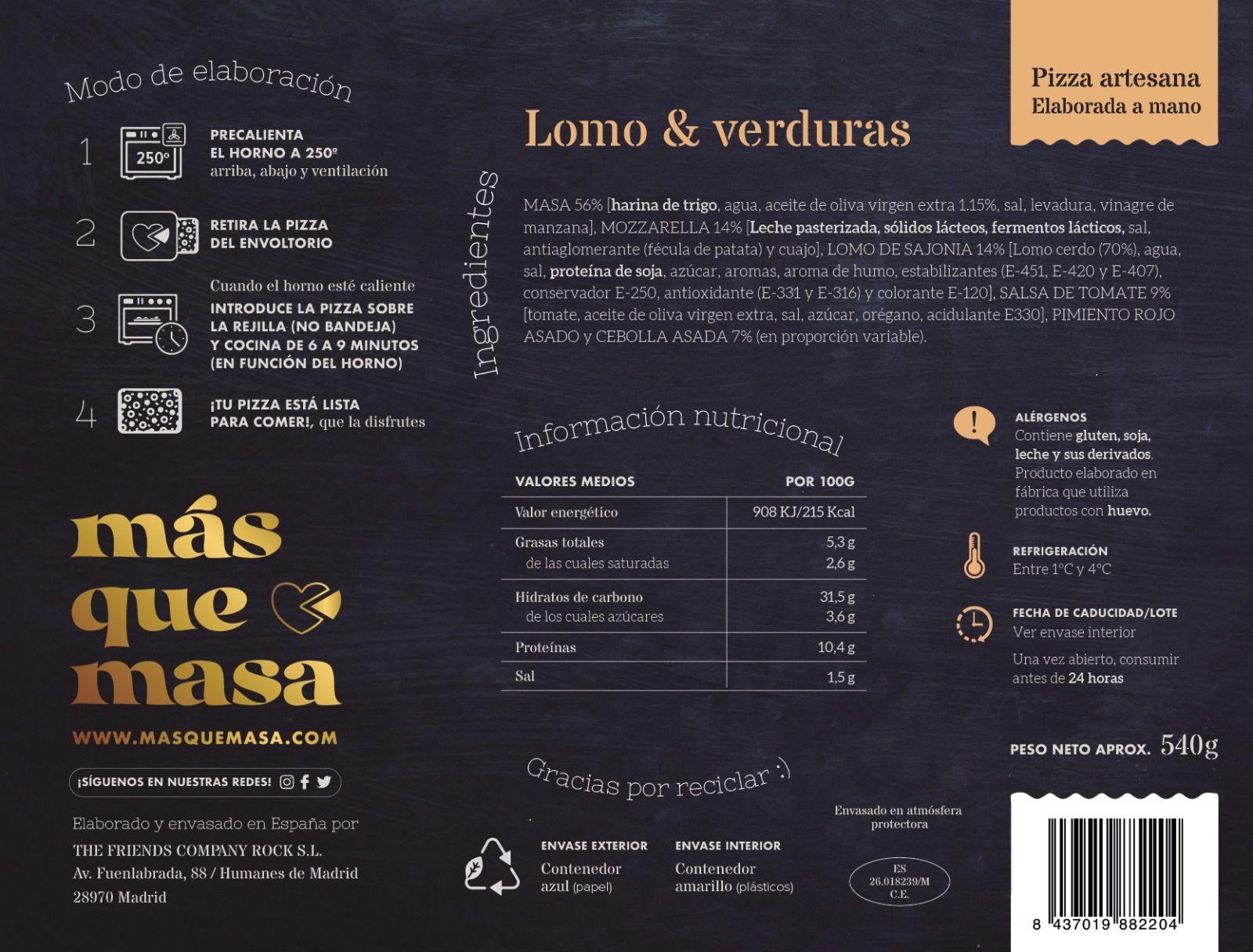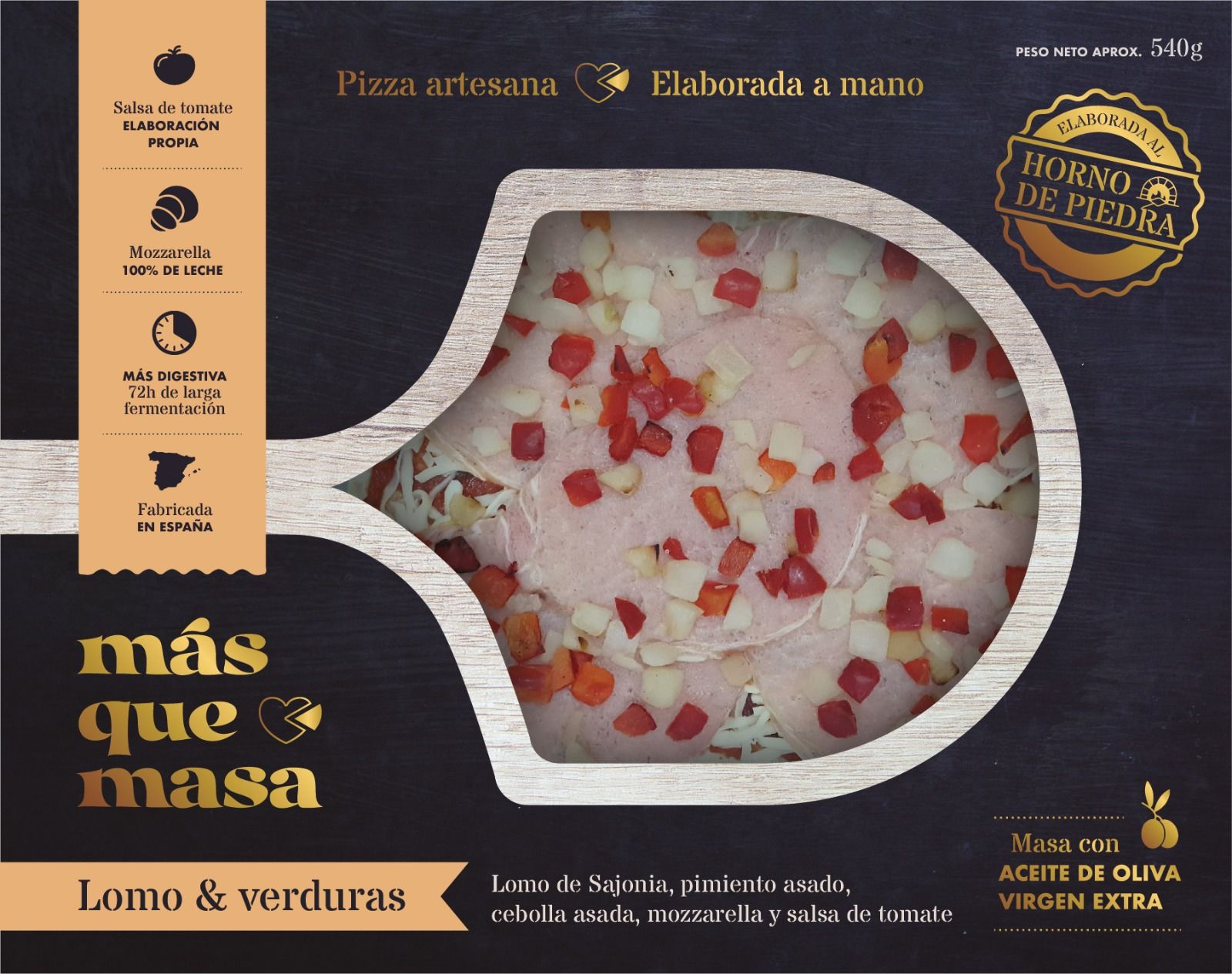 Lomo de Sajonia, pimiento asado, cebolla asada, mozzarella y salsa de tomate